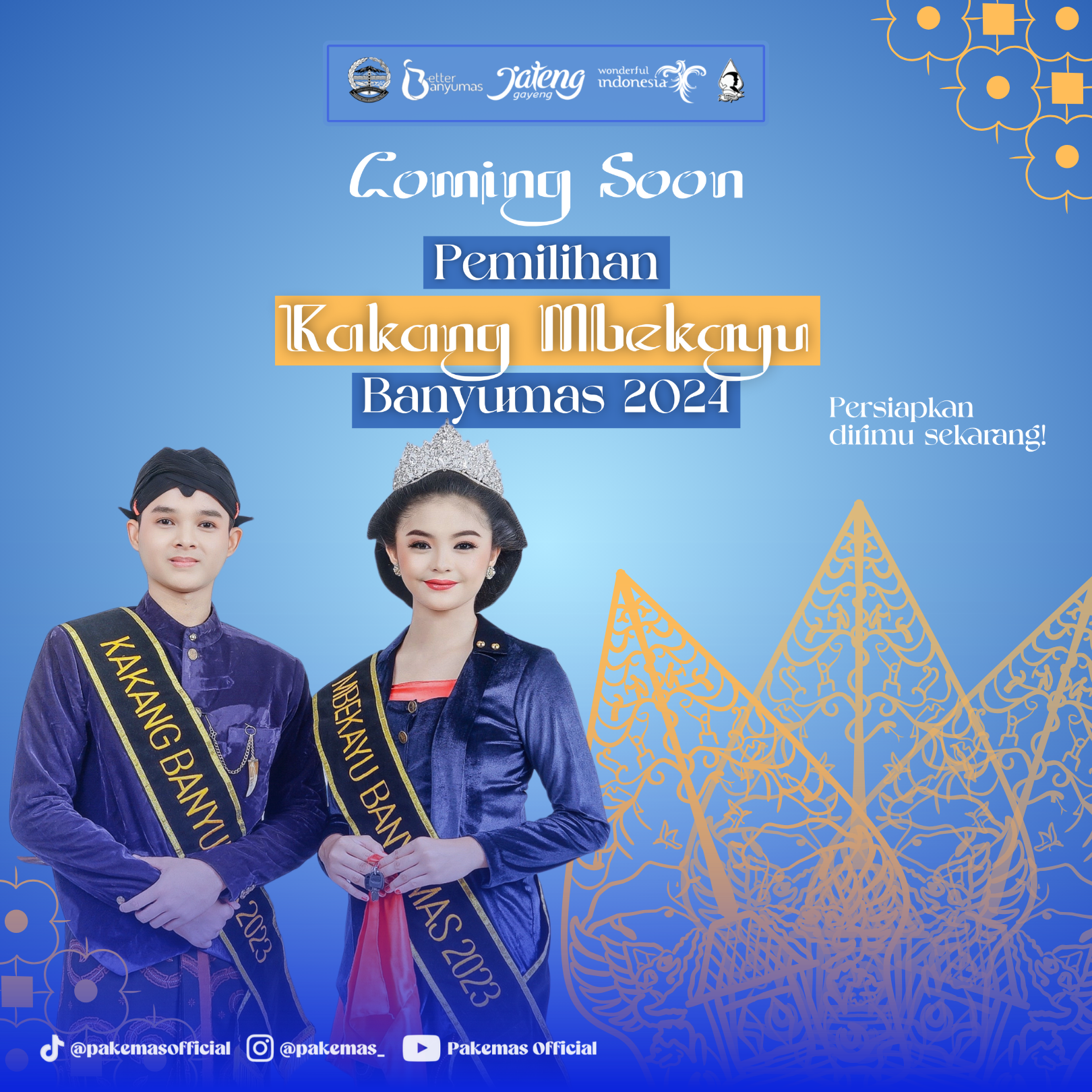 Dinas Pemuda, Olahraga, Kebudayaan dan Pariwisata Kabupaten Banyumas bekerjasama dengan Paguyuban Kakang Mbekayu Duta Wisata Banyumas (PAKEMAS) akan menyelenggarakan Pemilihan Kakang Mbekayu Duta Wisata Banyumas 2024.